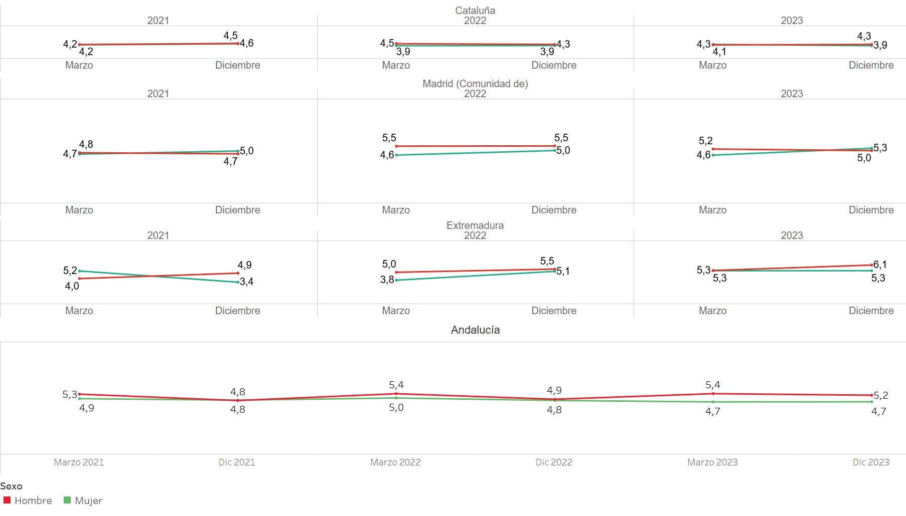 En Andalucía, los hombres se han auto-ubicado ideológicamente más a la derecha que las mujeres en estos años; además, con una tendencia creciente. Por otra parte, en Cataluña, estas diferencias son más modestas, sugiriendo una menor variación ideológica entre hombres y mujeres en esta comunidad. En Extremadura, llama la atención que hay una mayor discrepancia ideológica entre hombres y mujeres, tanto en 2021 como en 2022 y en Madrid, nos encontramos con un escenario muy interesante, ya que en 2021 y 2022, las mujeres se posicionaron más a la izquierda que los hombres, pero al término de 2023 esta tendencia se invierte con diferencias más pronunciadas a favor de las mujeres.
